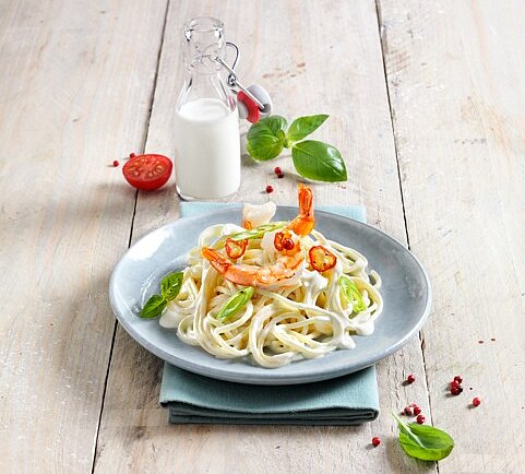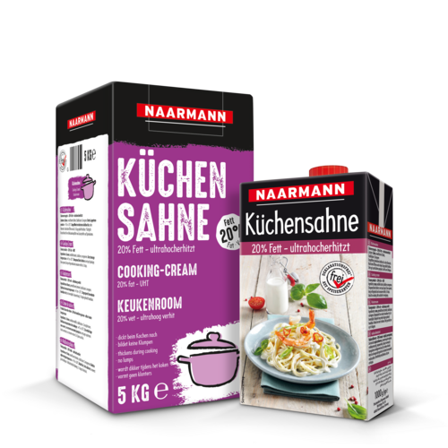 Darüber hinaus ist sie auch beim Kochen mit Wein, Essig und Zitrone oder anderen säurehaltigen Lebensmitteln gerinnungsstabil. Naarmann’s Küchensahne 20 % gibt es in praktischen 1000 g Verpackung sowie in der 5 kg Bag-in-Box.