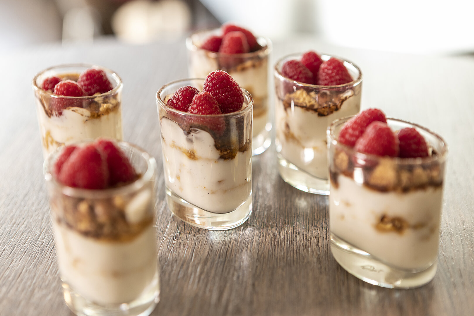 Nun die Crememasse mit den Spekulatius und Himbeeren in Dessertgläsern schichten.