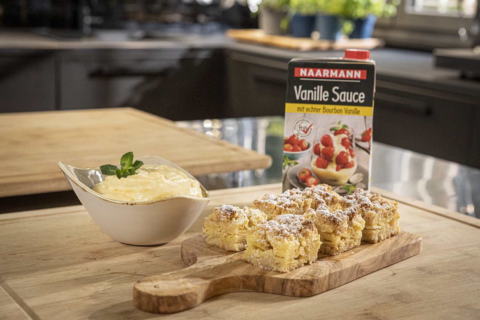 Das Ganze ist auch als vegane Alternative möglich. Hierzu einfach anstelle der Butter pflanzliche Margarine verwenden und die vegane Vanille Sauce reichen.