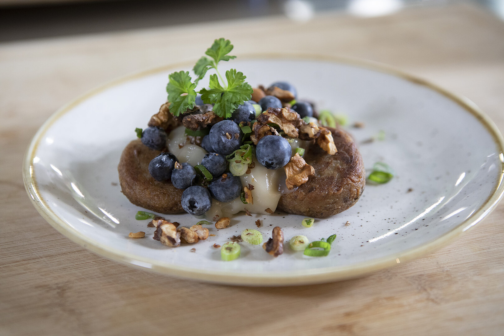 Anschließend werden die Bratlinge auf einem Teller mit dem Apfelpudding als süß-fruchtiges Topping serviert. Das Topping kann beispielsweise mit weiterem Obst und Nüssen nach Belieben erweitert werden.