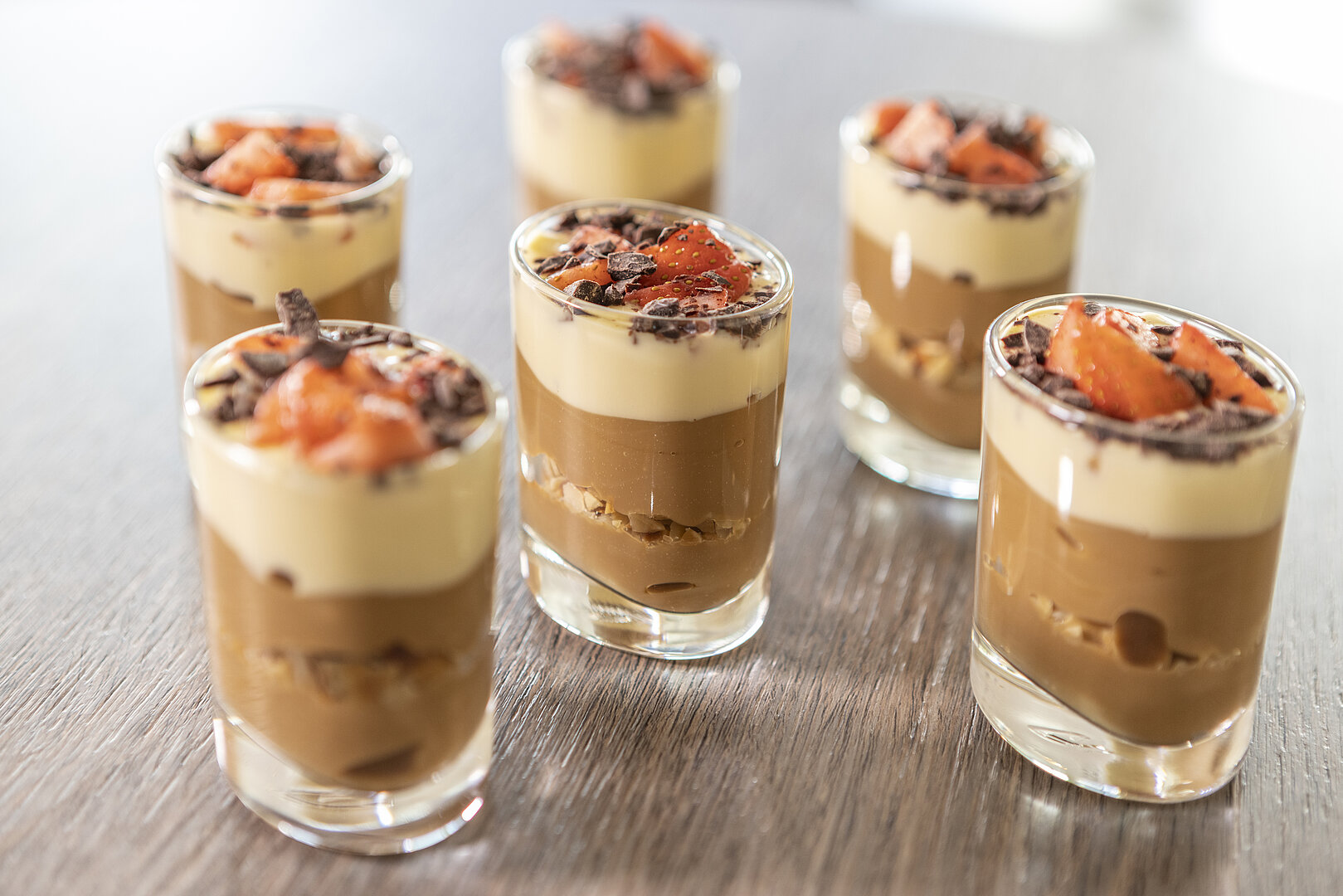 Alle Zutaten schichtweise in Dessertgläser füllen und zum Schluss mit Schokoraspeln ausgarnieren.