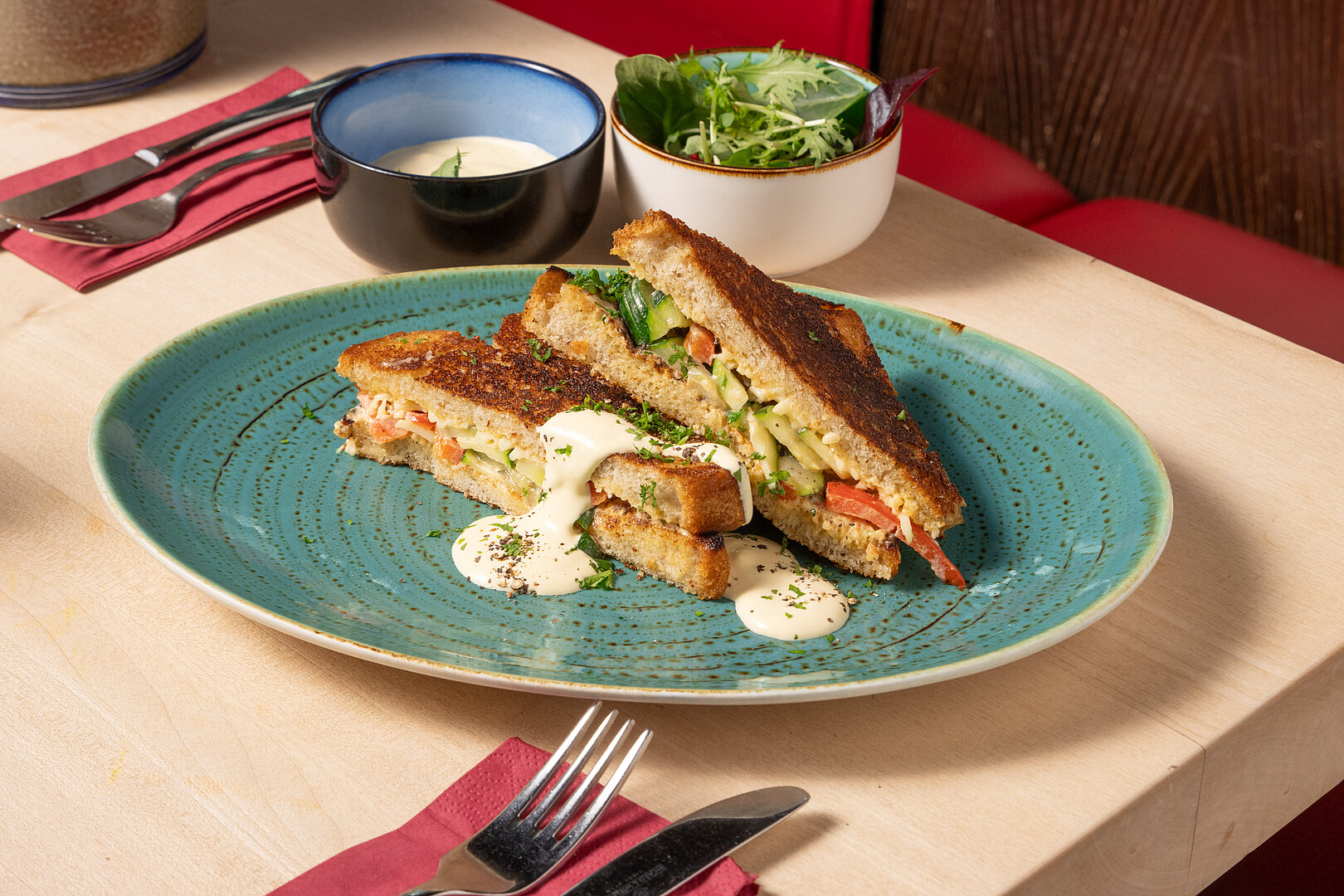 3. Die restlichen Toastscheiben darauflegen und leicht andrücken. Die Croques mit etwas Pflanzlicher Butter, von beiden Seiten auf der Grillplatte backen, bis der Käse geschmolzen ist und die Toastscheiben goldbraun sind.