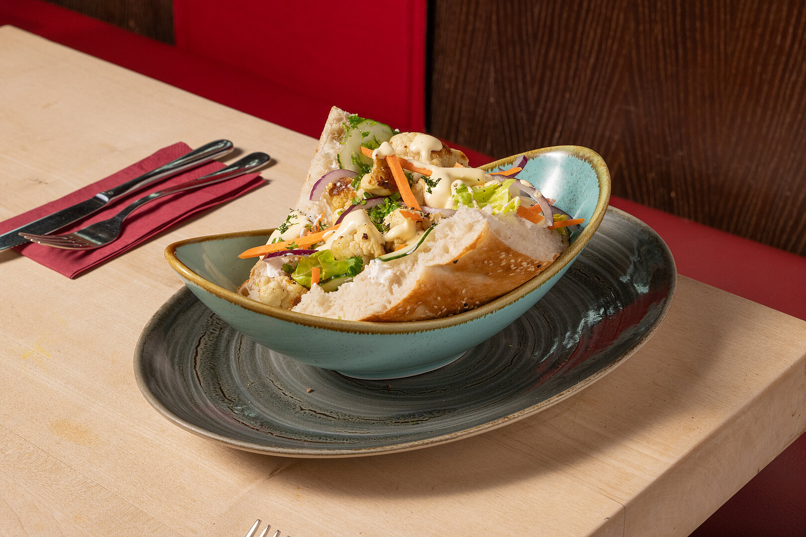 3. Das Brot im Ofen oder unter dem Salamander kurz aufbacken und in Viertel schneiden.