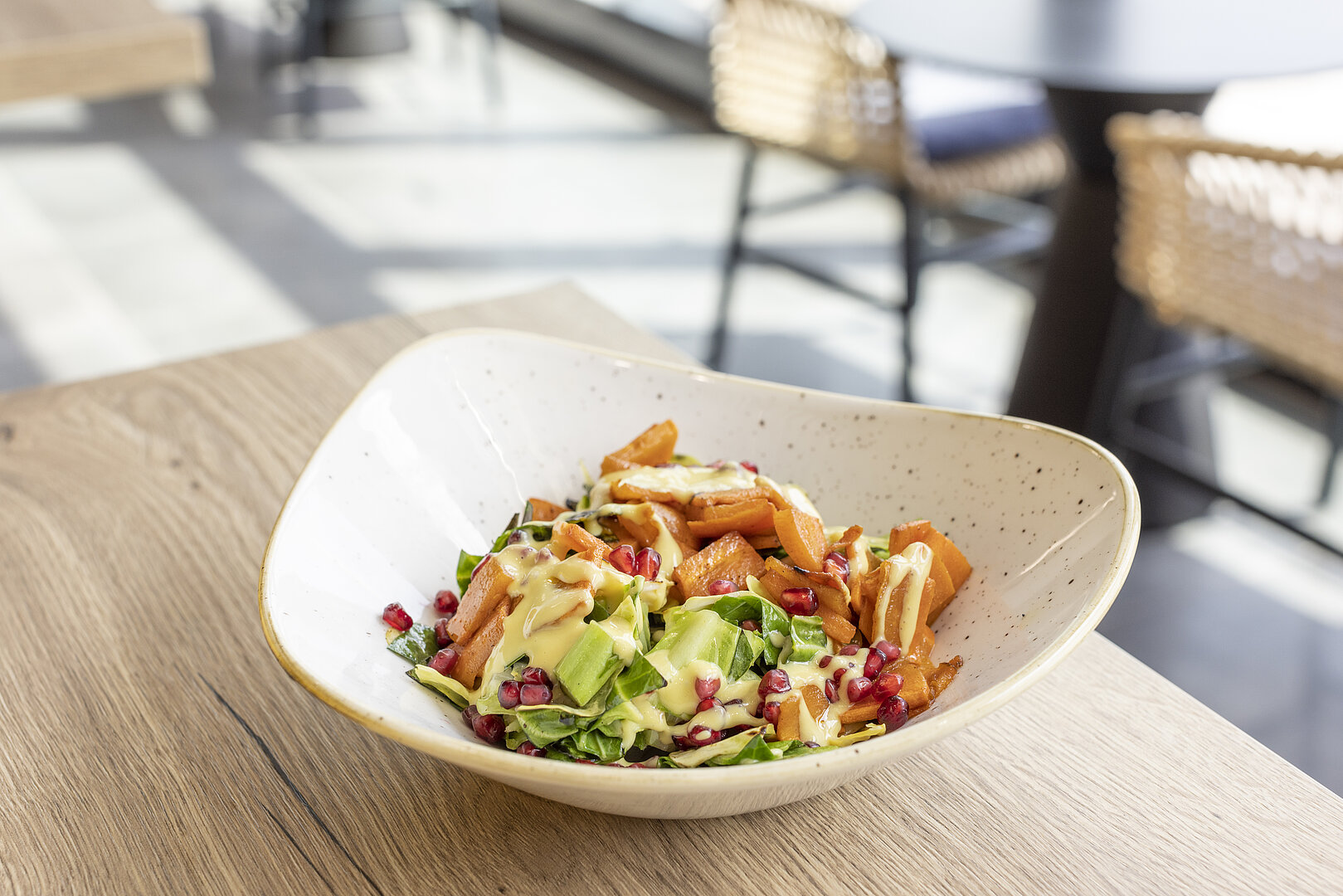 Mit dem Dressing das geröstete Gemüse marinieren und mit den Granatapfelkernen finalisieren.
