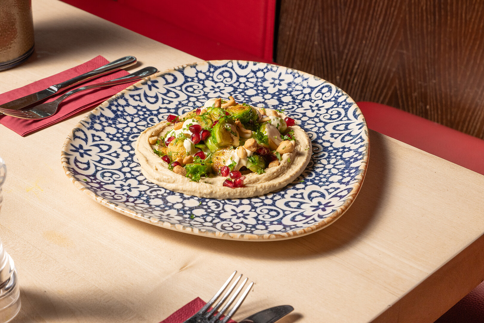 Mit geröstetem Fladenbrot servieren und Hummus servieren. Du kannst den Rosenkohl auch in der Pfanne rösten.