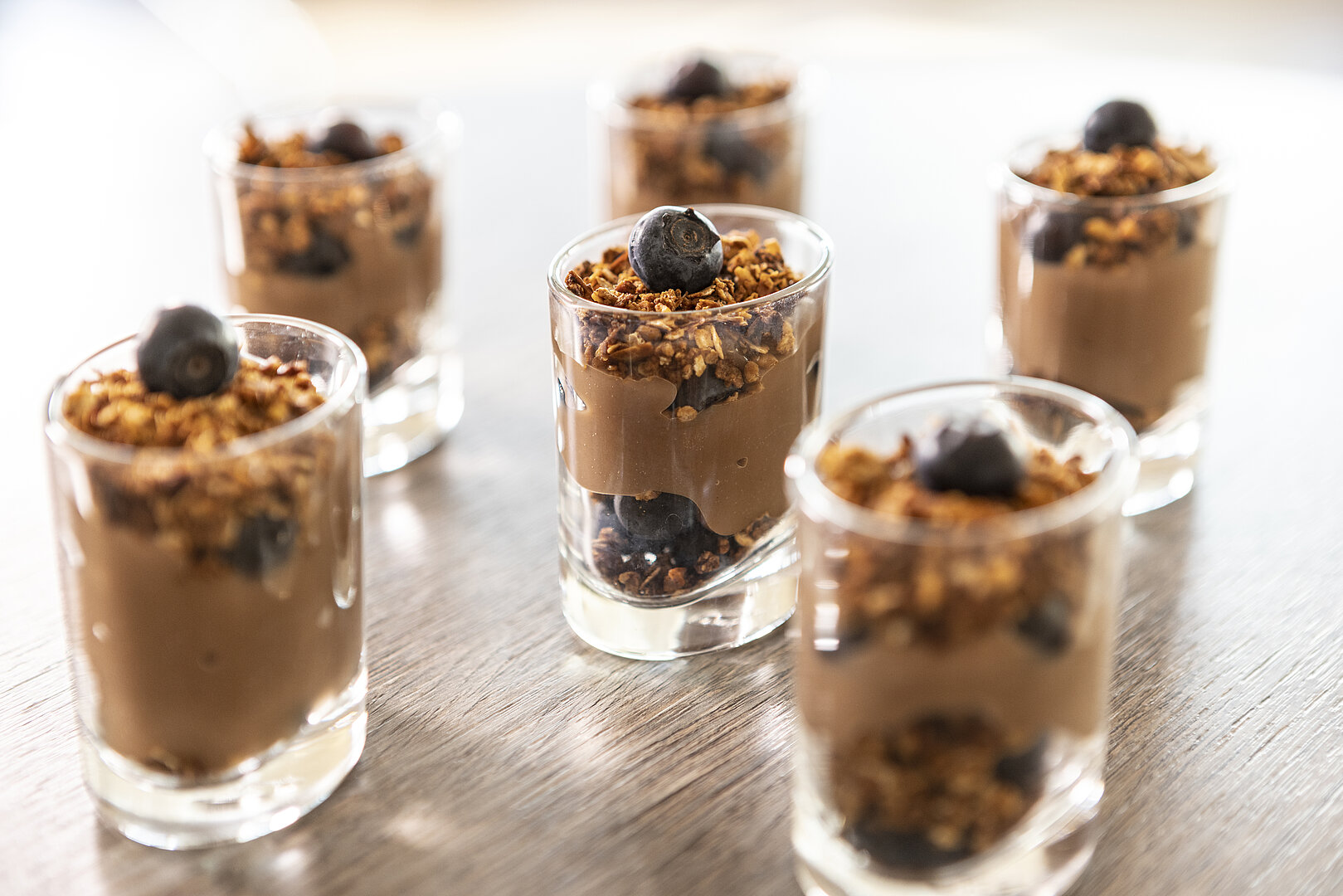 Jetzt das Müsli mit Haselnusspudding und frischen Beeren in Dessertgläsern schichten.