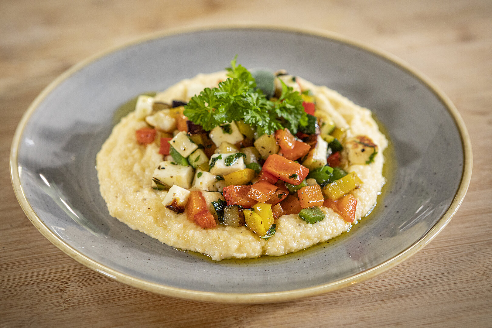 Die Butter unter die Polenta rühren und auf Suppenteller verteilen. Darauf nun das Halloumi-Gemüse geben und mit Thymian, Kräutersalz, Pfeffer, getrockneten Blüten und den Kürbiskernen anrichten. Zuletzt wird das Gemüse mit dem Kürbiskernöl beträufelt und das Ganze direkt serviert.