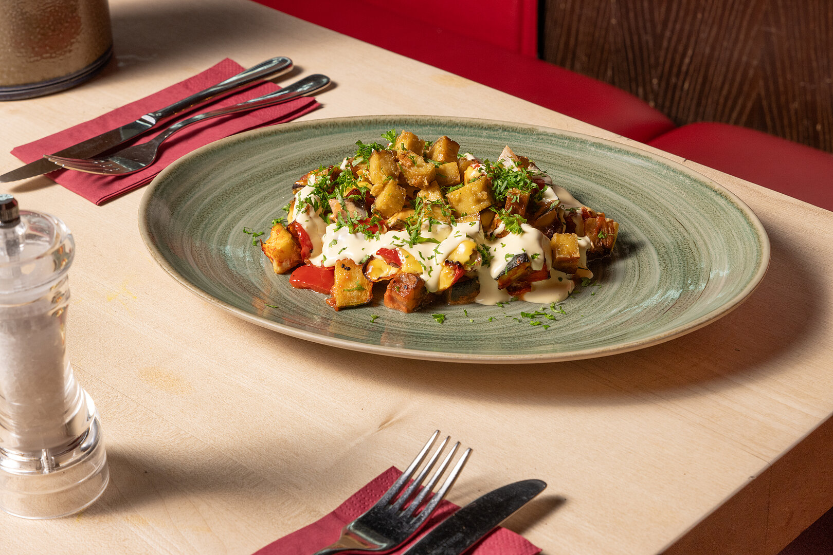 9. Das Gemüse auf einem Teller anrichten, etwas Hollandaise über das gebackene Ratatouille geben.