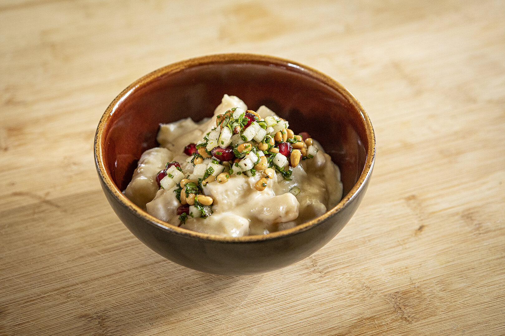 Anschließend in einer Bowl mit gerösteten Pinienkernen, Granatapfelkernen und frischen Kräutern anrichten.