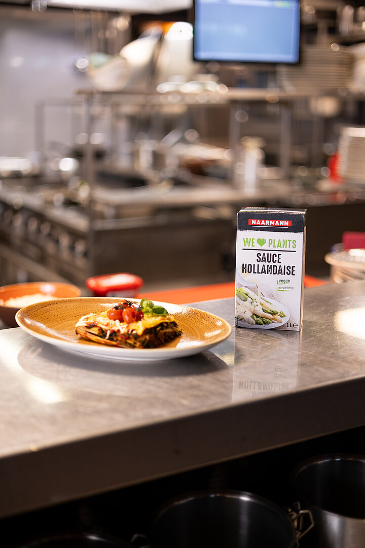 8. Eine Schicht Lasagneplatten, etwas Gemüse und Sauce Hollandaise daraufgeben.