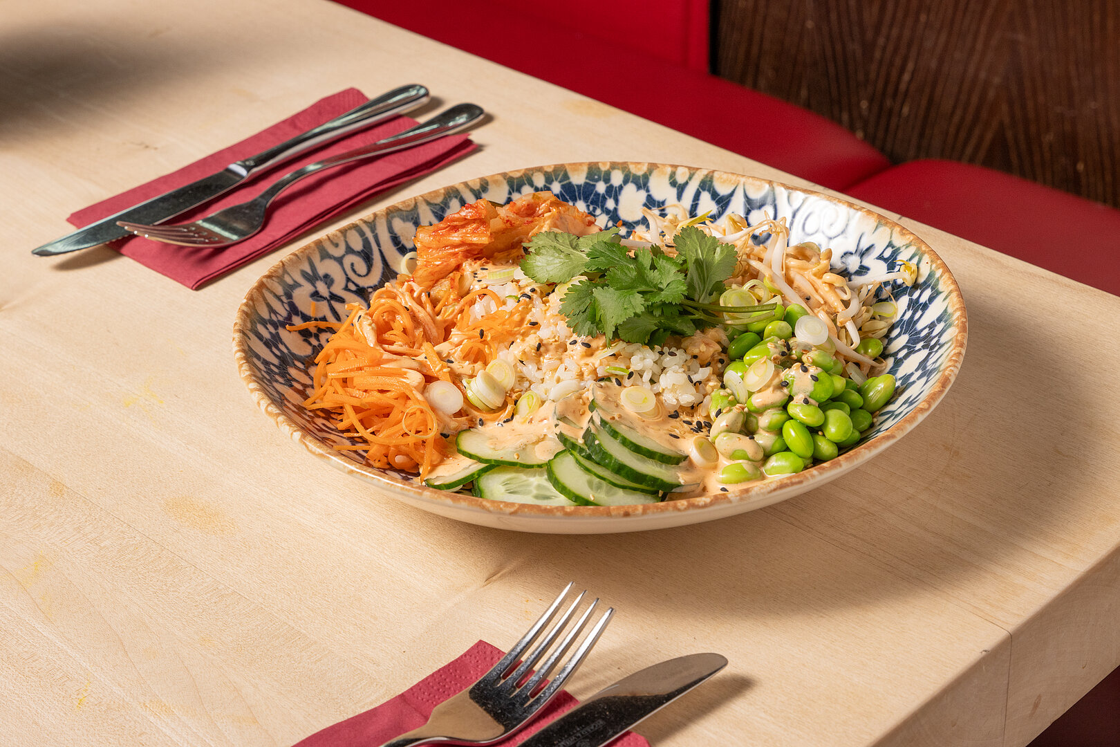 2. Den Reis auf vier Schalen verteilen und mit, Sprossen, in feinen Streifen geschnittenen Karotten, Edamame, Kimchi und Gurkenscheiben anrichten.