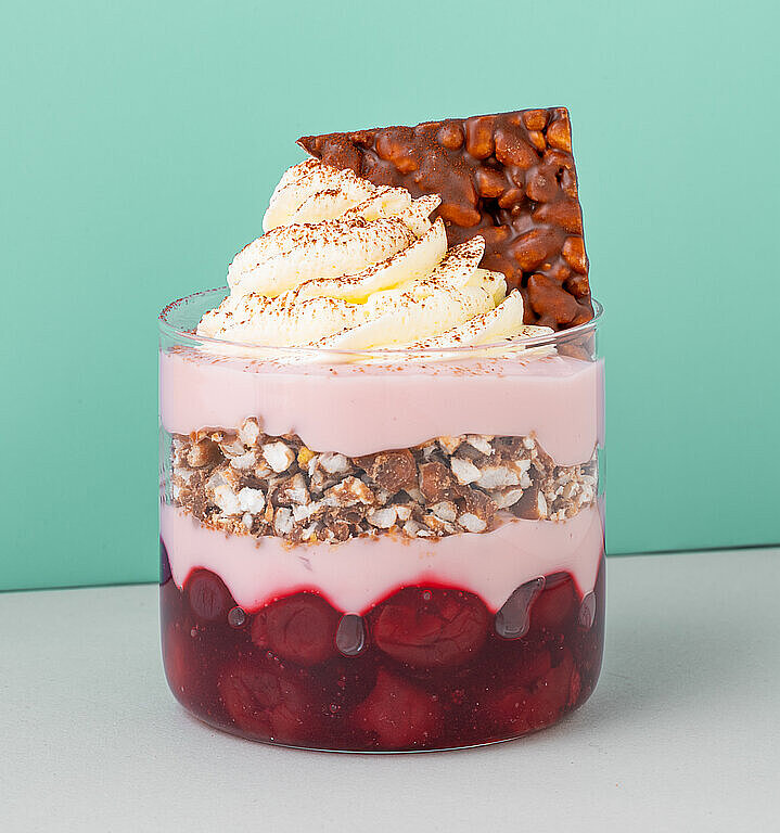 Den Kirschkompott in ein Dessertglas füllen. Darauf Amarena Kirsch Pudding und gehackten Schokoladen-Puffreis schichten. Als obere Schicht noch einmal Amarena Kirsch Pudding hinzugeben und mit geschlagener Sahne und Kakaopulver toppen.