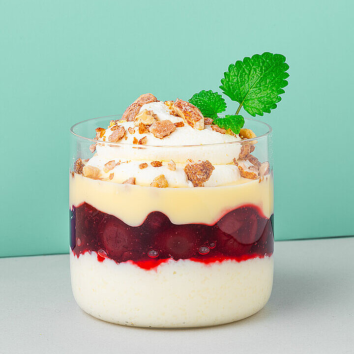 Den Grieß Pudding, den Kirschkompott und die Vanille Sauce in einem Dessertglas schichten. Anschließend mit geschlagener H-Sahne und gehackten gebrannten Mandeln toppen.