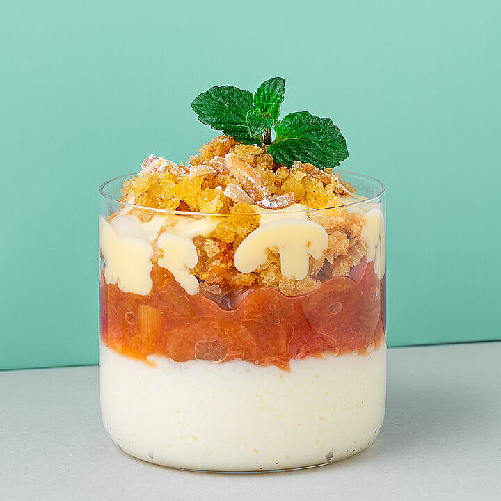 Den Grieß Pudding in ein Dessertglas geben. Anschließend den Rhabarberkompott und die Mandelkuchen-Brösel darauf schichten. Anschließend mit Kuchenstreusel und Vanille Sauce toppen.