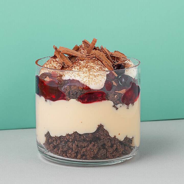 Den gebröselten Schoko Muffin in ein Dessertglas füllen. Den Sahnepudding mit Haselnussgeschmack und den Kirschkompott darauf schichten. Mit gebröseltem Schoko Cookie, Sahne und Schokostreusel toppen.