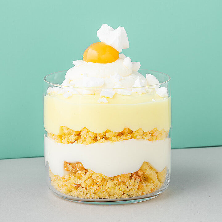 Den gebröselten Zitronenkuchen in ein Dessertglas füllen. Den Profi-Joghurt und den Zitronen-Limetten Pudding darauf schichten. Anschließend mit geschlagener Sahne und Lemon Curd toppen.