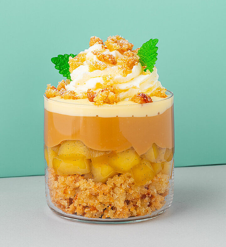 Die Kuchenstreusel in ein Dessertglas geben. Den Apfelkompott und den Karamell Pudding darauf schichten. Anschließend mit Vanille Sauce und geschlagener Sahne toppen.