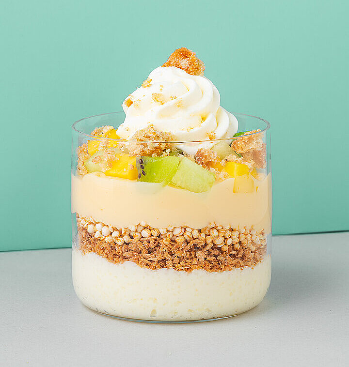 Den Grieß Pudding in ein Dessertglas füllen. Die gerösteten Kokosflocken, den gepufften Quinoa und den Mango Pudding darauf schichten. Mit Obstsalat aus tropischen Früchten garnieren. Anschließend mit geschlagener Sahne, gehobelter weißer Schokolade und zerbröselten Kokos Keksen toppen.