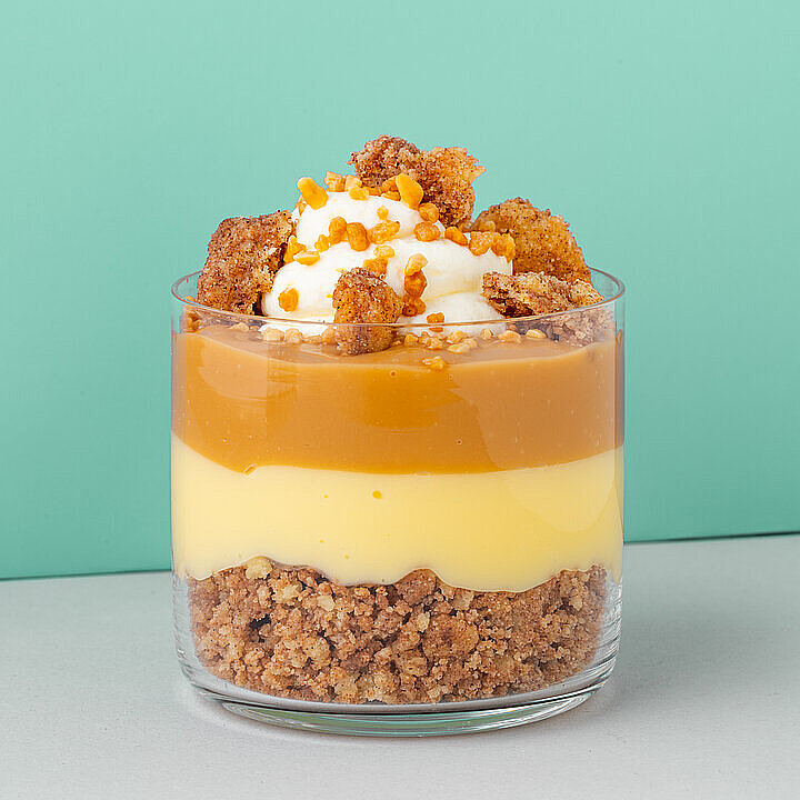 Vanille Crumble in ein Dessertglas füllen. Darauf Vanille Pudding und Karamell Pudding schichten. Mit geschlagener Sahne und Krokant toppen.