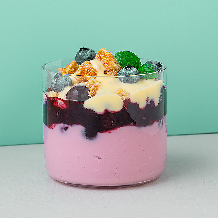 Den Waldfrucht Pudding in ein Dessertglas füllen. Darauf karamellisierte, pürierte Blaubeeren und Vanille Sauce schichten. Mit Kuchenstreuseln und Blaubeeren toppen.